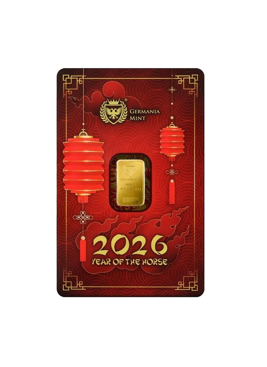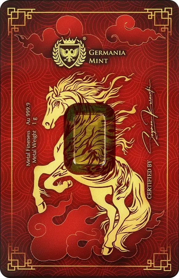 Šis 1 gramo gryno aukso luitas „Kinų Arklio metai 2026“, nukaldintas Germania Mint kalykloje, įkūnija vieną dinamiškiausių Kinų zodiako simbolių – Arklį.