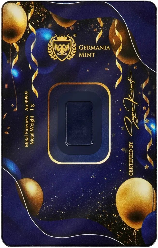 Šis 1 gramo gryno aukso luitas „Laimingo Gimtadienio!“, nukaldintas Germania Mint kalykloje, yra ypatinga dovana, kuri gimtadienio progai suteikia dar daugiau prasmės.