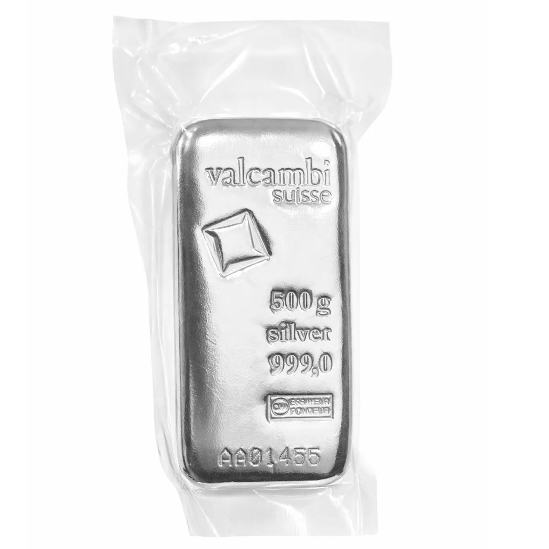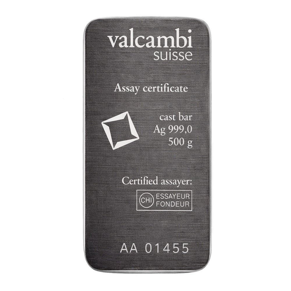 Sertifikuotas Valcambi Suisse 500 g investicinio sidabro luitas.