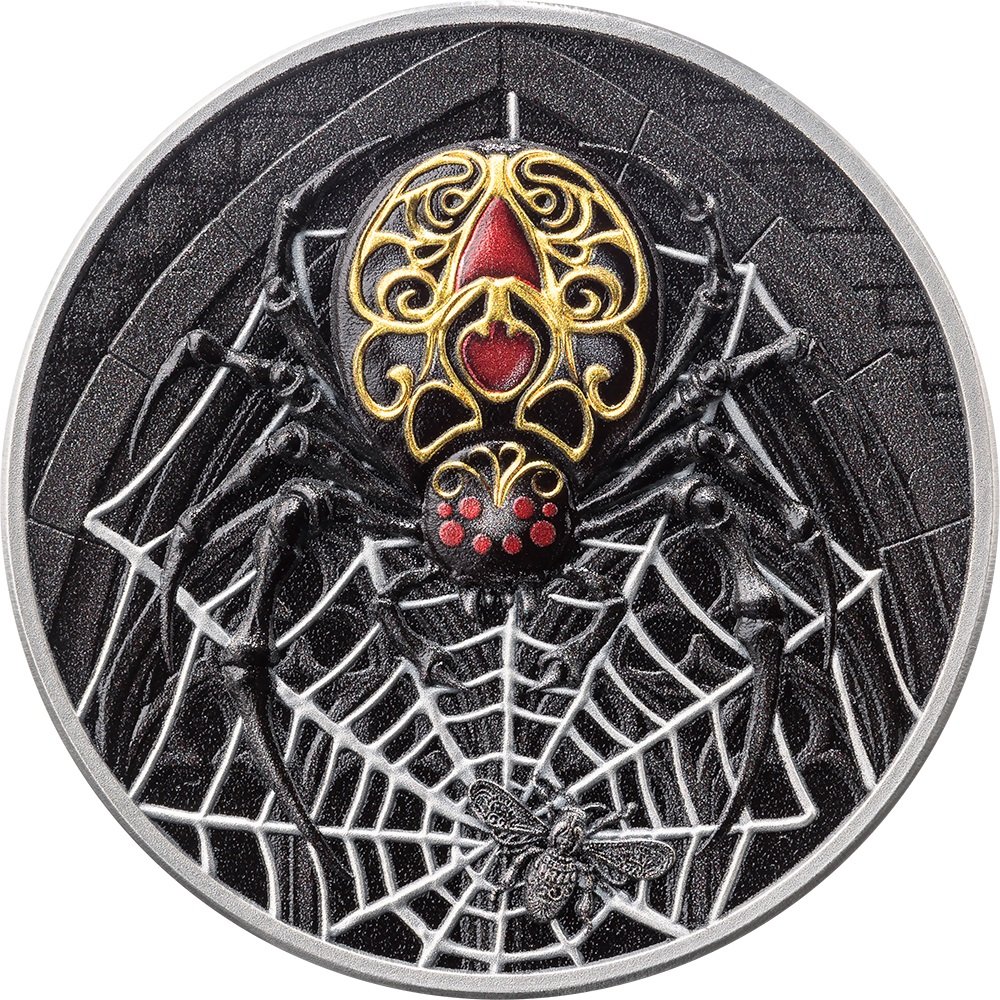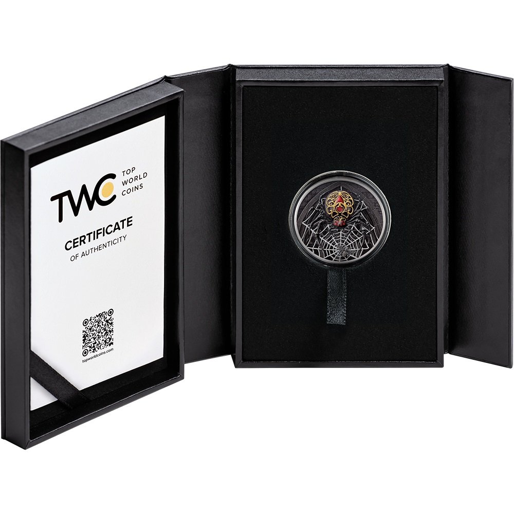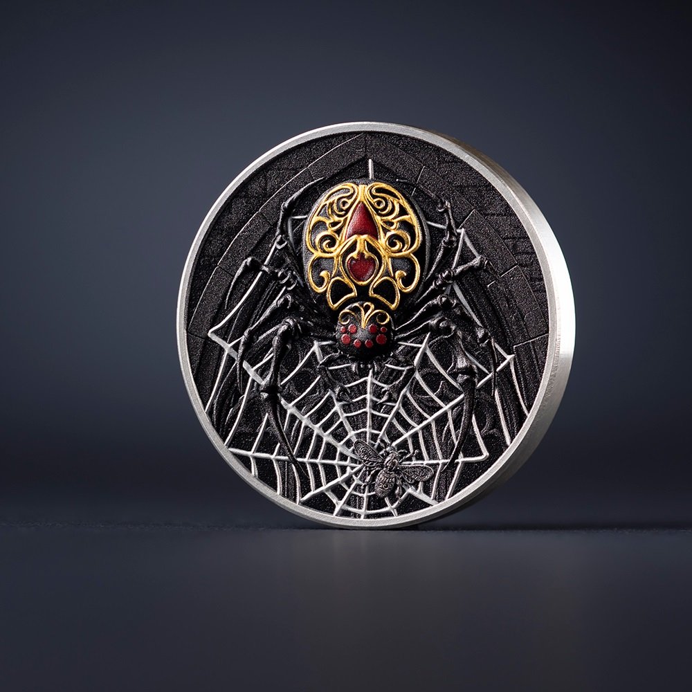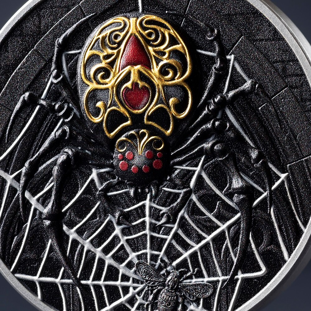 Išskirtinis aukštas reljefas atskleidžia kiekvieną mirtino tinklo giją, o skaitmeninis auksavimas nušviečia puošnią, auksiniais ornamentais dekoruotą kaukę – apgaulingą grožį, slepiantį vieną pavojingiausių gamtos plėšrūnų.