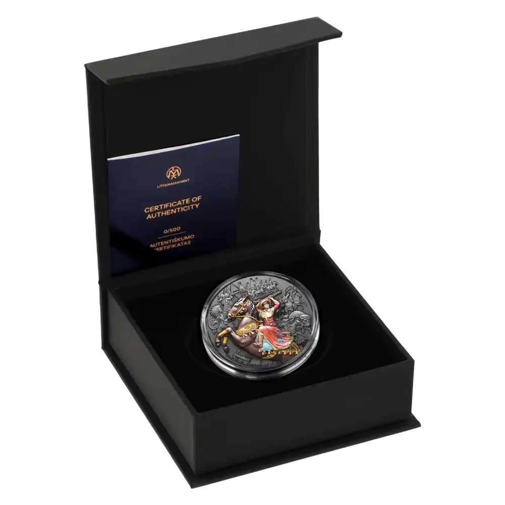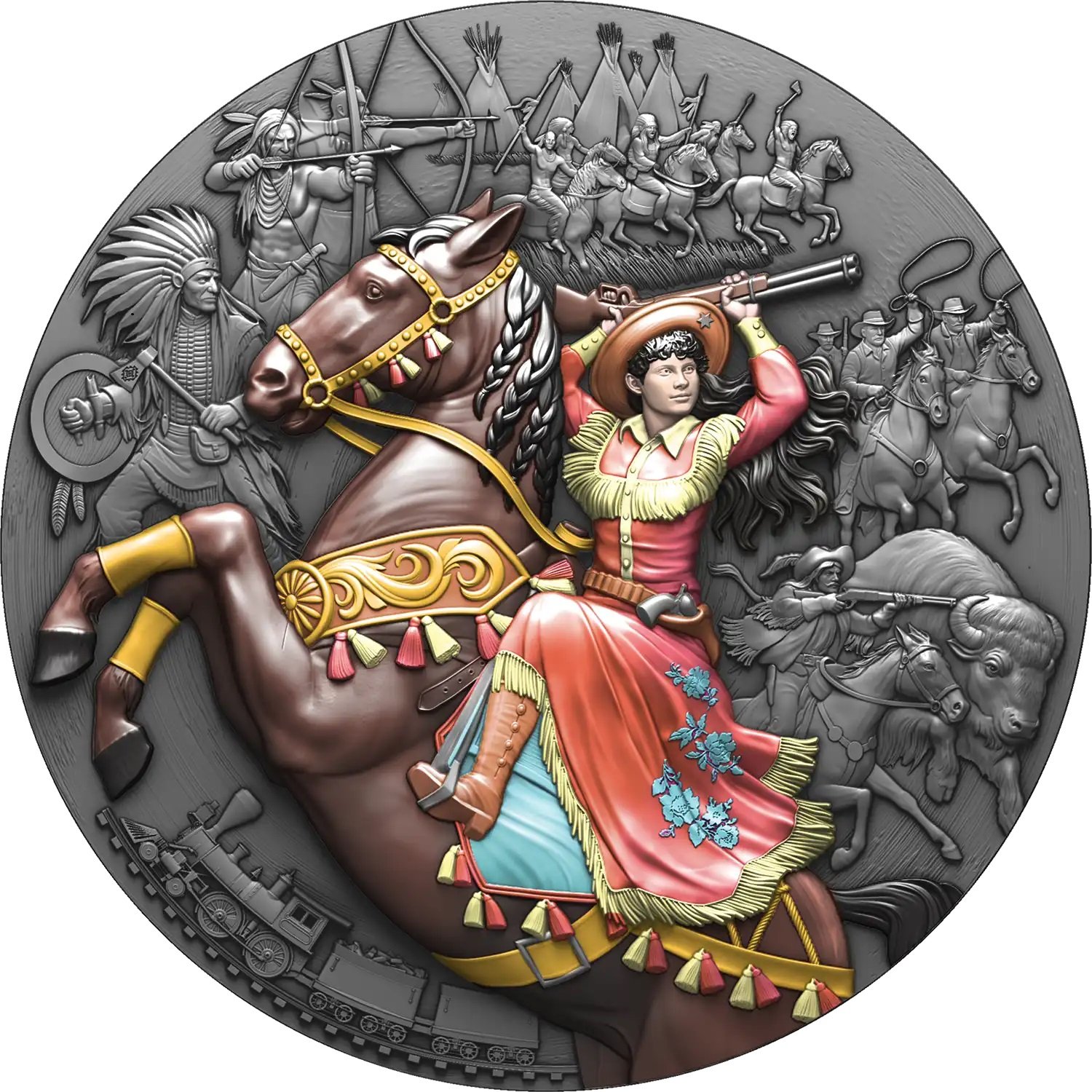Monetos dizainas perteikia šią istoriją: centrinėje kompozicijoje – herojė ant žirgo, pasirengusi lemiamai akimirkai, o fone atsiveria laukinių vakarų pasaulis – raiteliai, bizonas, indėnų kariai ir pirmųjų traukinių siluetai. Tai ne tik portretas, bet ir visos epochos atspindys.