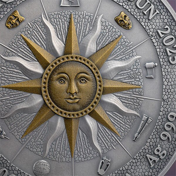 Averse skaitmeninis paauksavimas subtiliai paryškina kiekvienos mūzos simbolinius atributus, įprasminančius jų vaidmenį mene.