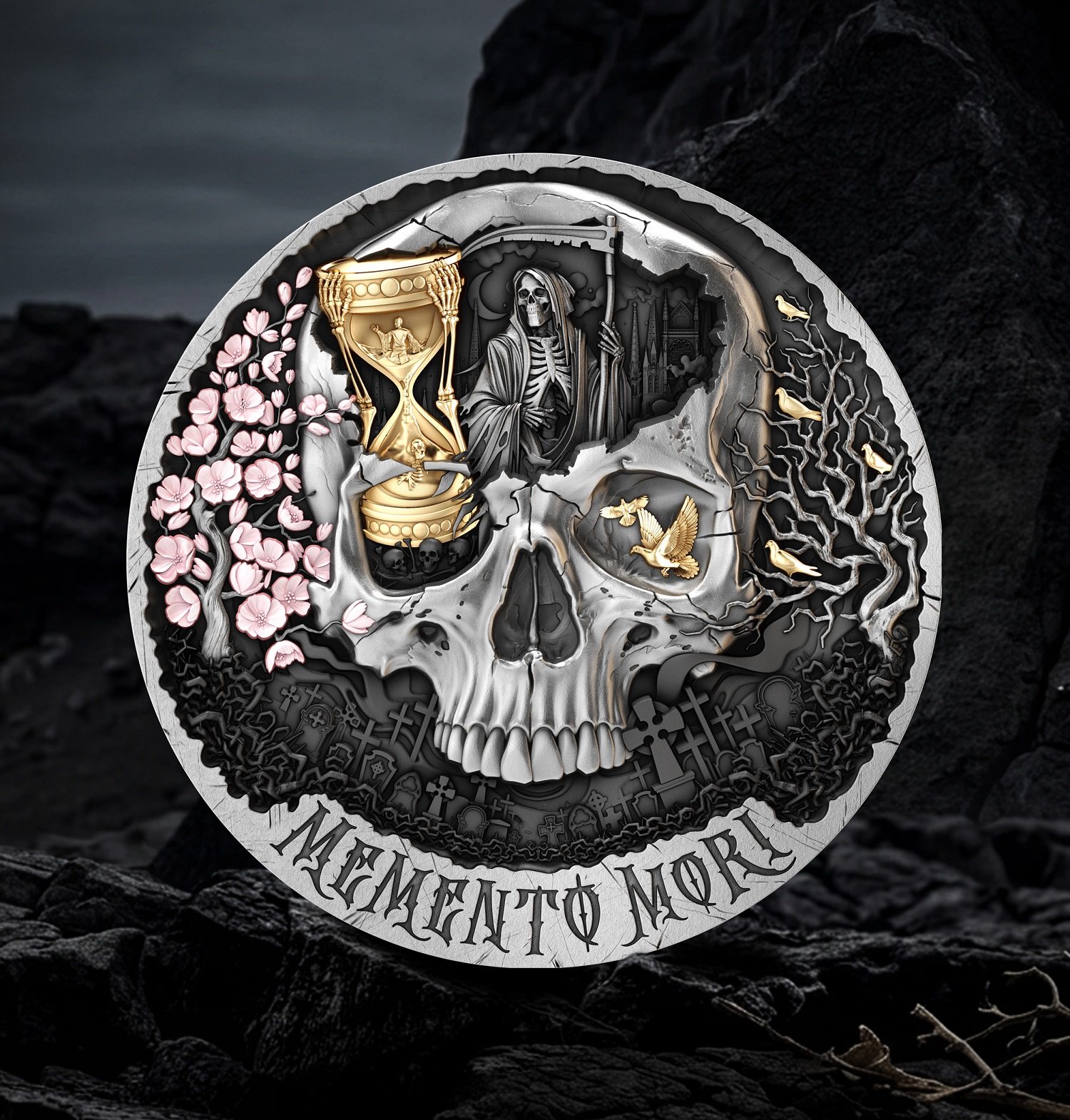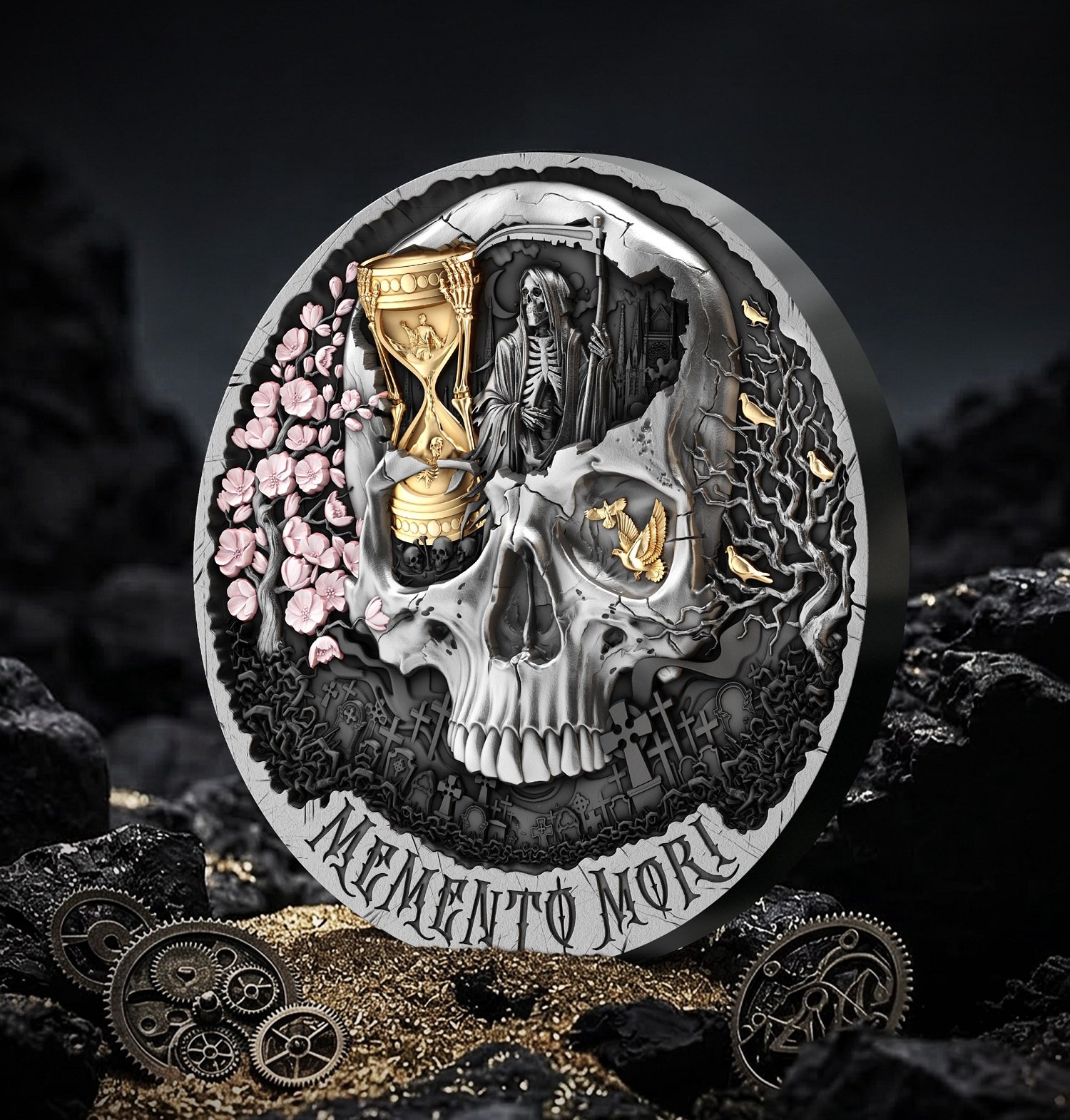 Moneta „Memento Mori“ gimė iš šios laiko meditacijos – apie vienintelę valiutą, kuri neturi nei formos, nei mato. Kaip senoviniai aukso smėlio grūdeliai, slystantys pro mūsų pirštus, laikas nuolat keliauja iš praeities į ateitį, abejingas turtui ir tylus gailesčiui.