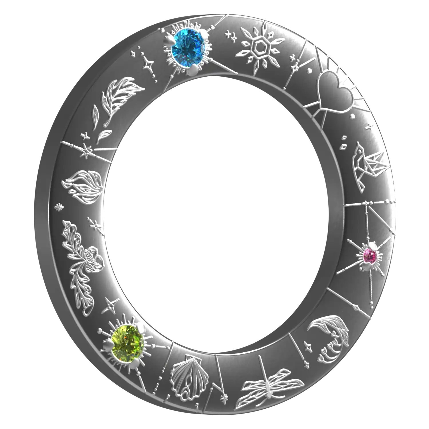 Unikali, simboliška moneta-pakabukas inkrustuota natūraliais rožinio safyro, mėlynojo topazo ir peridoto brangakmeniais.