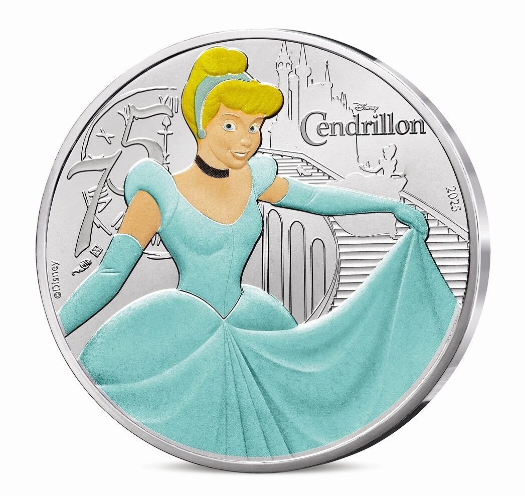 Ši kolekcinė moneta 2025 m. mini 75-ąsias Disney animacinio filmo „Pelenė“ metines
