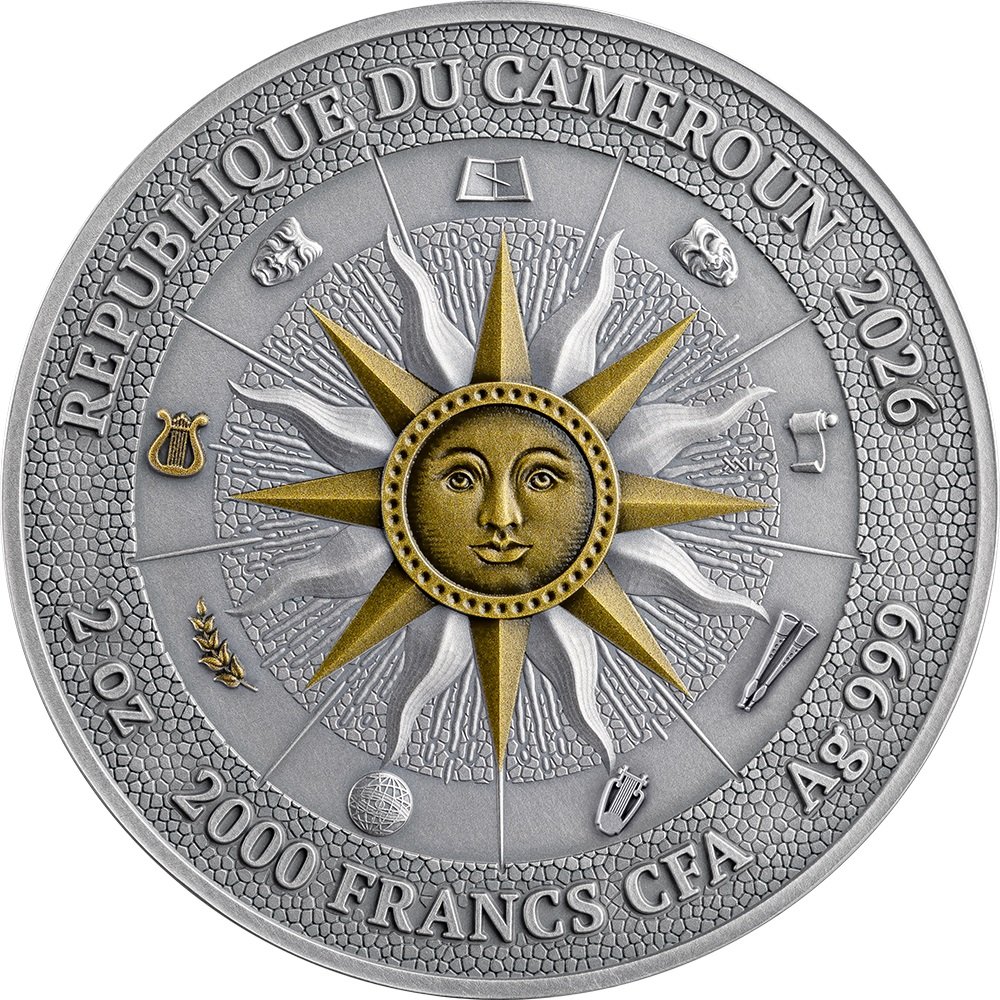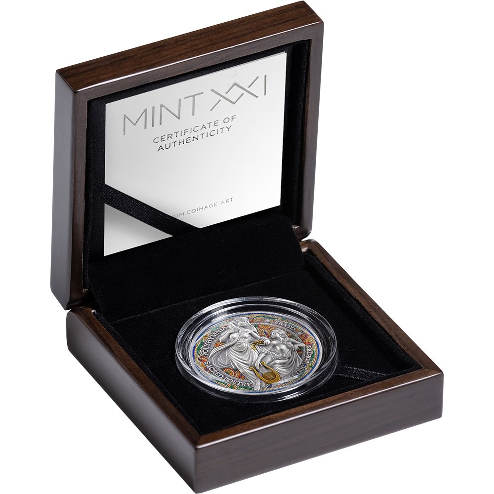 Ši 2 oz sidabrinė moneta vaizduoja abi mūzas išraiškingame aukštame reljefe, perteikdama jų formų eleganciją ir poetinių pasaulių kontrastą. Skaitmeninė spauda atkuria būdingą senovinės mozaikos efektą, o skaitmeninis paauksavimas suteikia kompozicijai švytinčių akcentų, praturtindamas ją klasikine didybe ir gylio pojūčiu.