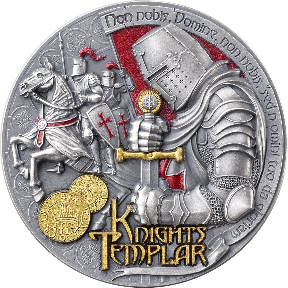 Nukaldinta iš 2 oz .999 prabos gryno sidabro su antikiniu padengimu, moneta vaizduoja Tamplierių riterį įspūdingame aukštame reljefe – su pakeltu kalaviju, pasiruošusį kovai. Skaitmeninė spauda ir paauksavimas suteikia scenai gyvybės – nuo sodriai raudonų kryžių iki šventiškai spindinčio aukso detalių.